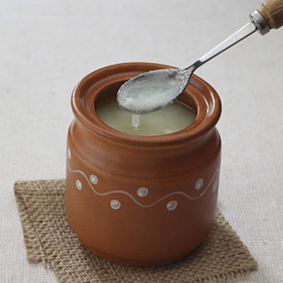 We follow the traditional ghee making process to make pure and authentic ghee. Full cream whole cow milk is set to curd overnight. Set curd is churned in wooden churner using vilona-bilona method to separate butter from the curd. Separated butter is washed and melted into ghee by our experts who can make awesome tasting ghee. We also add some herbs to enhance the nutritional value of the ghee.